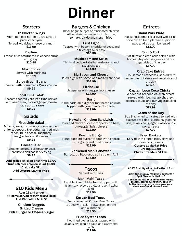 Welcome to First Light, a hidden gem nestled in the beautiful Corolla, North Carolina. Located at 793 Sunset Blvd, this inviting eatery promises a blend of delectable comfort food and a warm, welcoming atmosphere that leaves you feeling right at home. With a phone number of +1 252-453-4664, you're just a call away from indulging in a delightful meal.