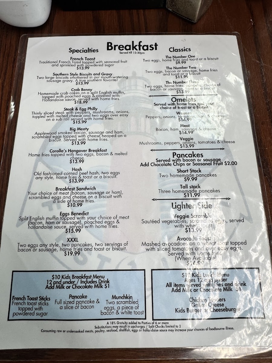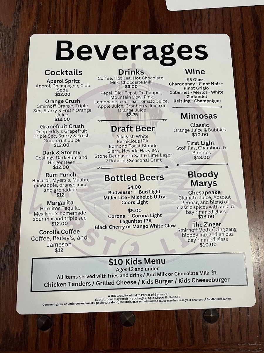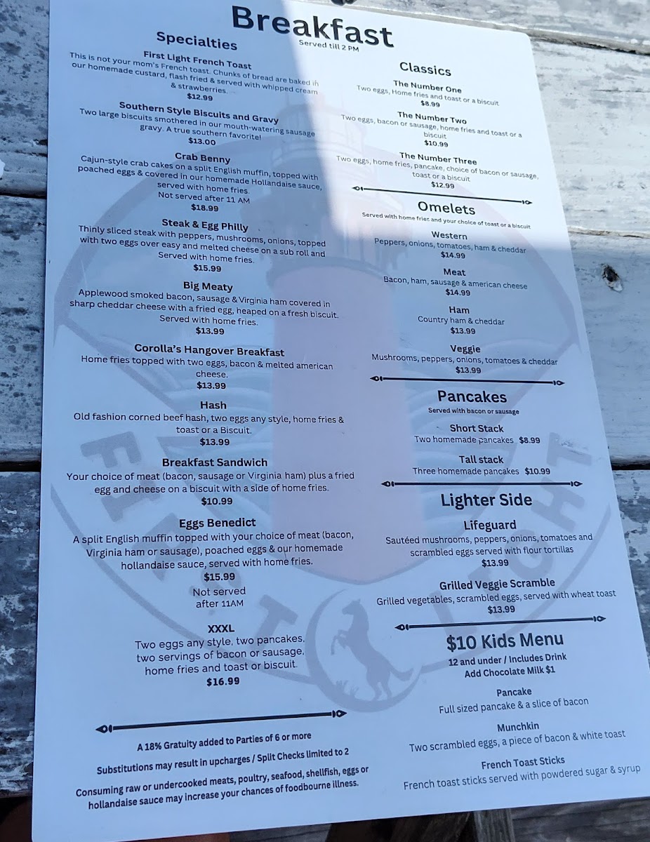 Welcome to First Light, a charming eatery nestled in Corolla, NC, where every meal is a delightful experience. This culinary gem specializes in burgers and chicken, offering delicious options like the Chili Cheese Burger, smothered in rich melted cheddar and hearty chili, and the classic Fried Chicken Sandwich, a true southern staple. Prices are wallet-friendly, with most dishes under $13.